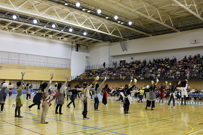 嵐の曲にのせて、キッチン用品を手に、エプロン姿のお母さんたちが踊るのだが、その人数の多さと