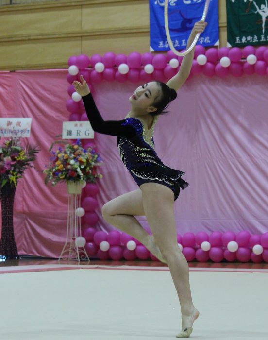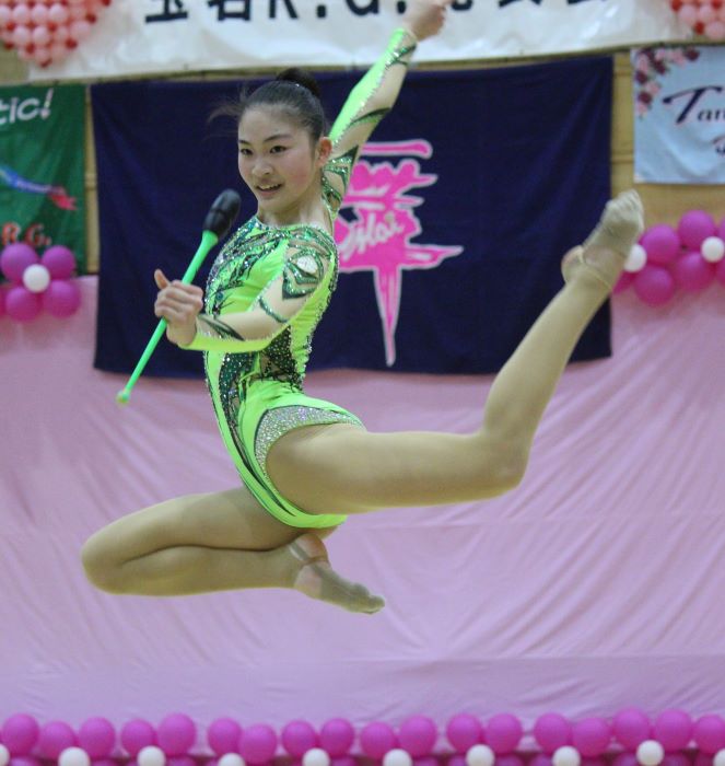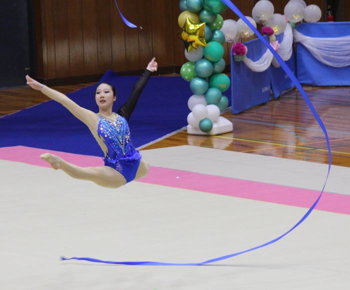 西澤愛乃(信愛女学院高校)も、3連ジャンプや3回もぐりなど身体能力の高さを見せるつけるダイナミックなリボンの演技で20.350。