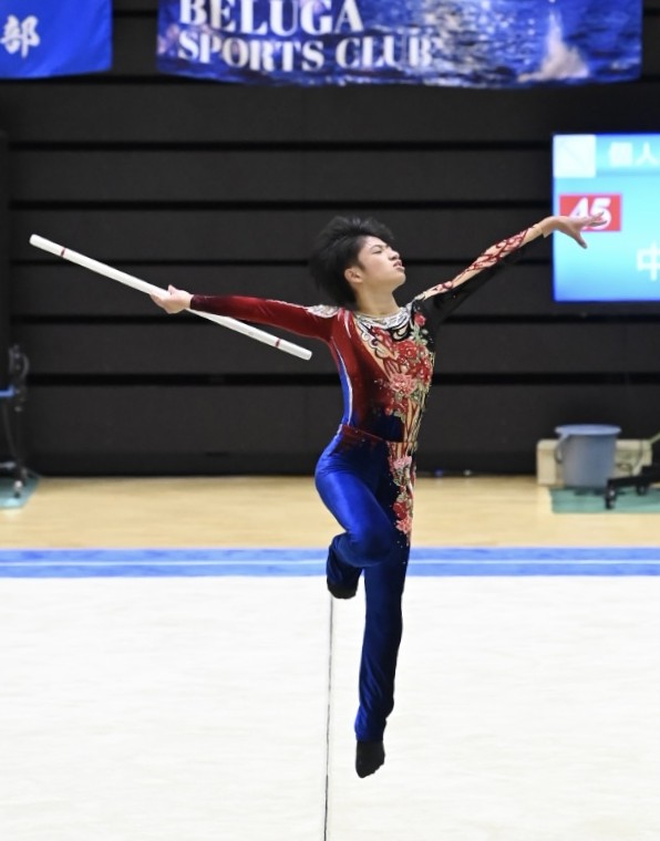 ミスが続いた後の少し騒然とした会場の空気を、三重県の一番手・佐川玄太がスティックの素晴らしいノーミス演技で一掃した。昨年もジュニアながら三重選抜に入っていた選手だが、まだ高校1年生。それでも、動きの幅が大きく、美しいつま先を見せながら、アグレッシブに動き、難しい内容も難しく感じさせないクリアな演技だった。